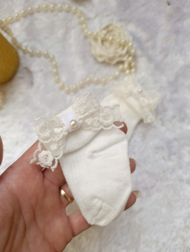 پاپوش نوزاد طرح دلبر ترکیب تور و مروارید رنگ خامه ای