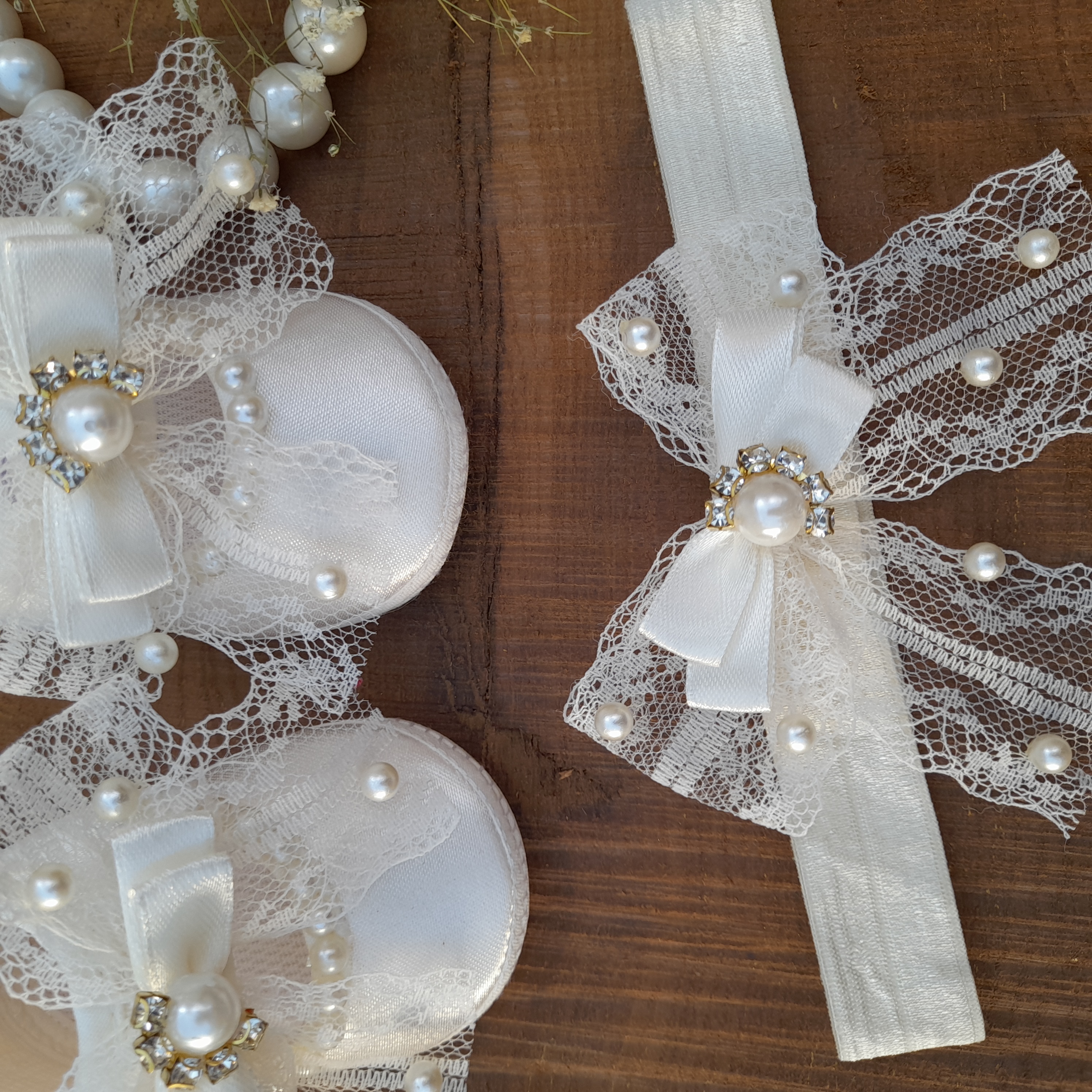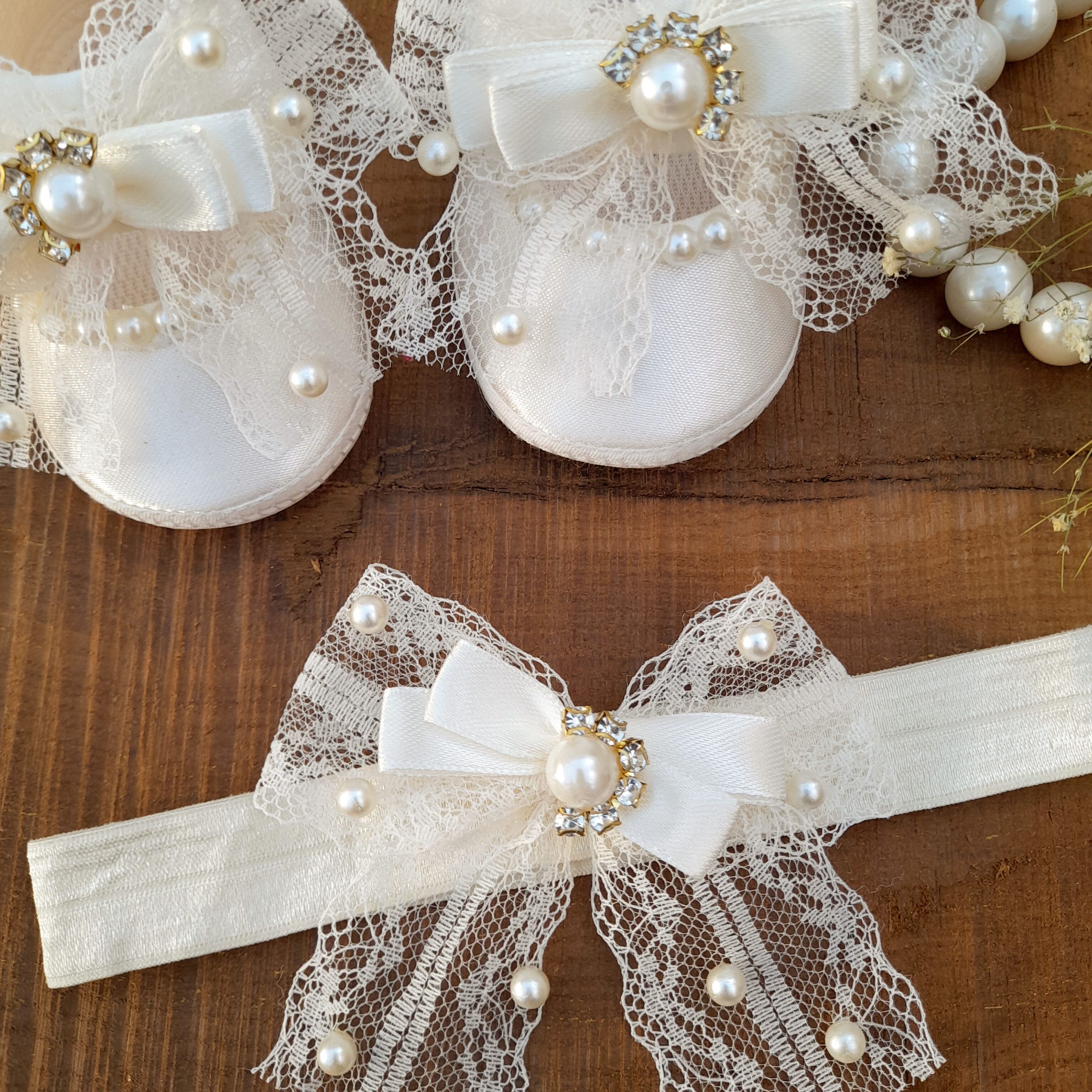 ست پاپوش و هد نوزادی مدل توری مرواریدی کار بسیلر شیک و دلبری هست. رنگ خامه ای جنس رویه ساتن و نرم هستش . در دوسایز صفر و یک سایز صفر با کف پای 10 س مناسب 3تا 6ماه سایز یک با کف پای 11س مناسب 6ماه تا 9ماه سوالی بود در خدمتم دوست عزیز