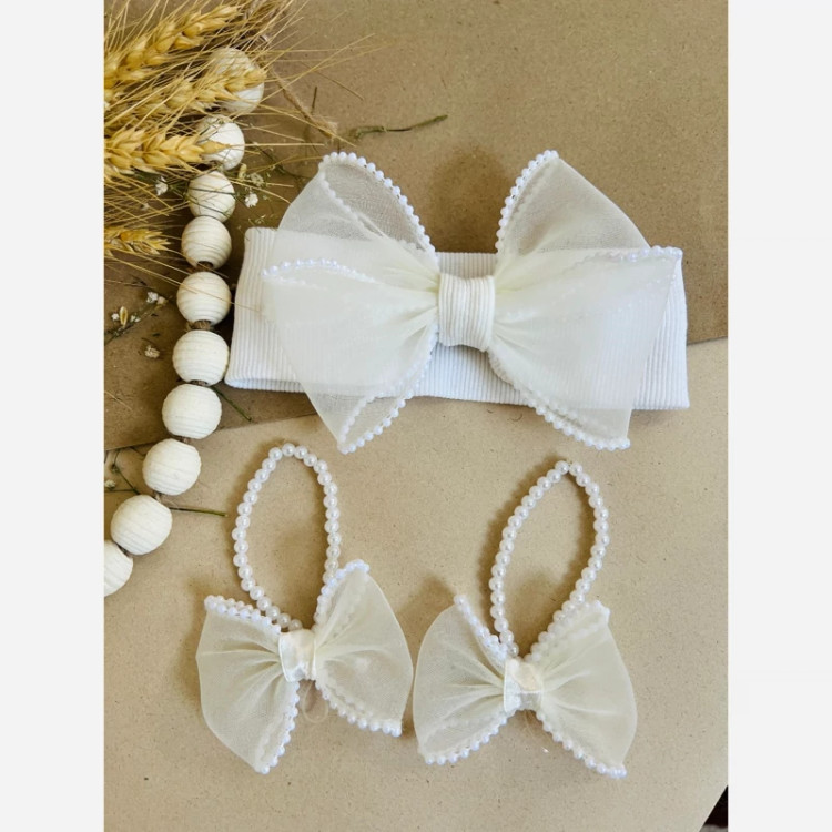 ست هد بند تریکو و پابند مرواریدی با پاپیون حریرلب مرواریدب