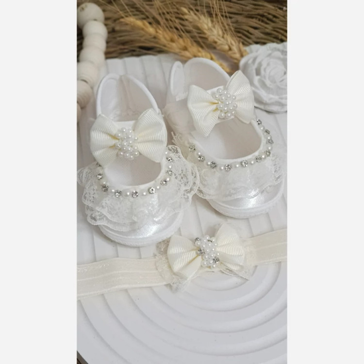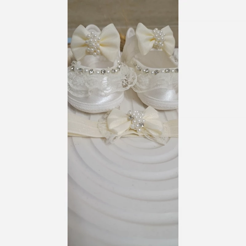 پاپوش و هد نوزادی طرح ناز رنگ خامه ای رویه ی کار ساتن ایستایی داره