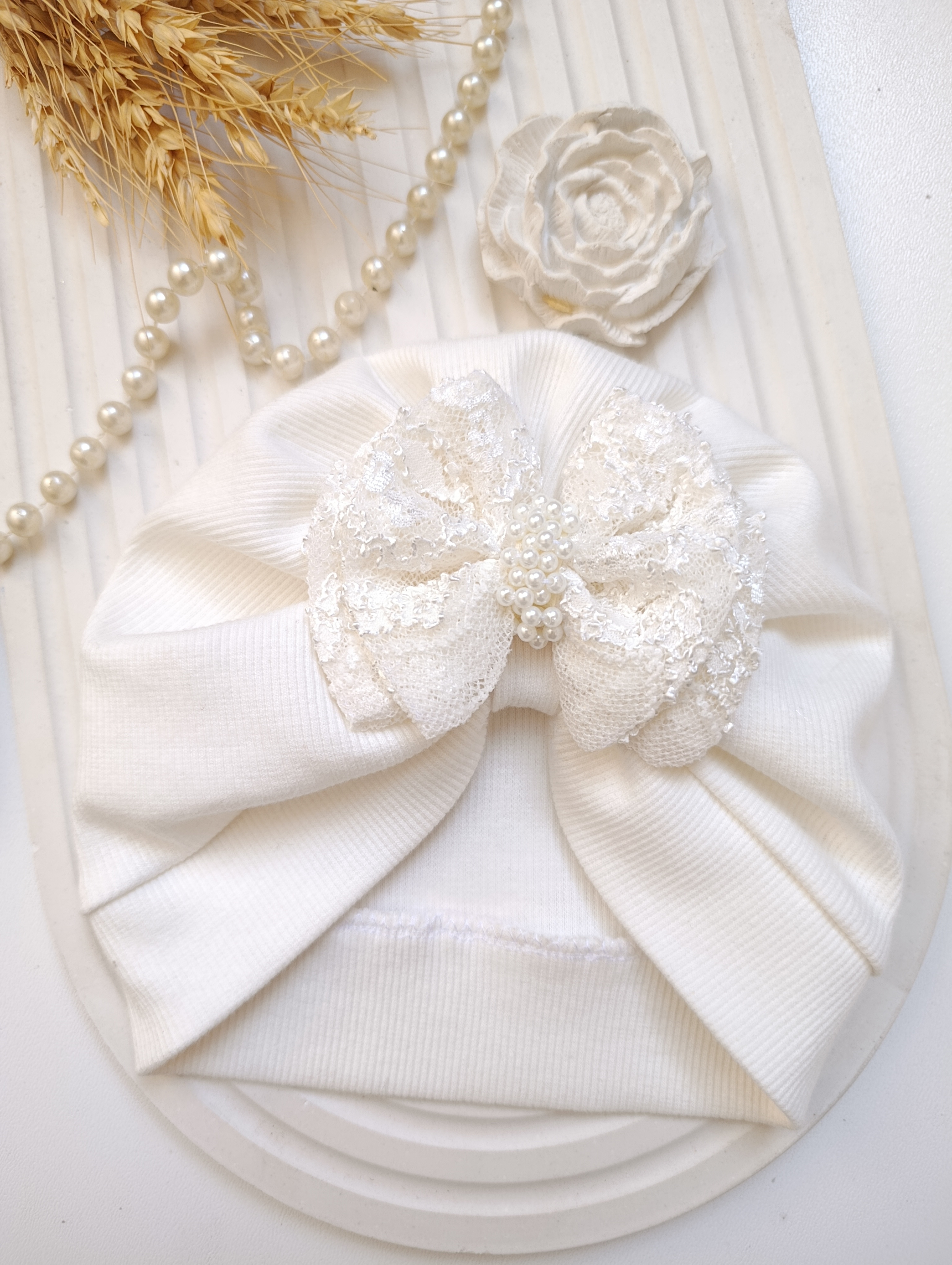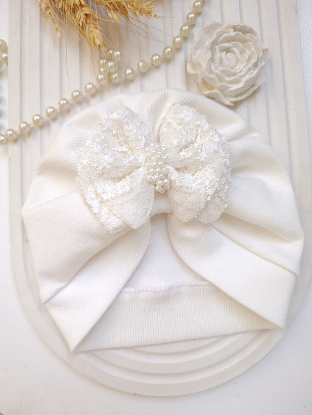 توربان تریکو پنبه نوزاد با پاپیون توری رنگ شیری ۴فصل
