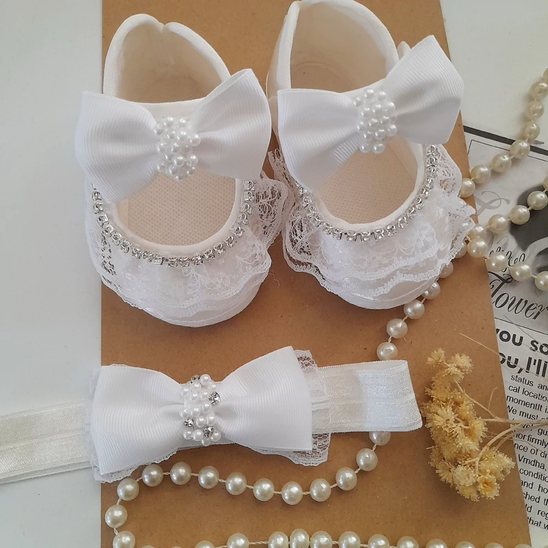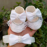 ست پاپوش و هد نوزادی بسیار سبک و راحت. جنس رویه کار ساتن رنگ سفید سایز صفر با کفی 10سانت مناسب 3تا 6ماه سایز یک با کفی 11سانت مناسب 6تا9 ماه برای عکسای آتلیه خیلی قشنگن