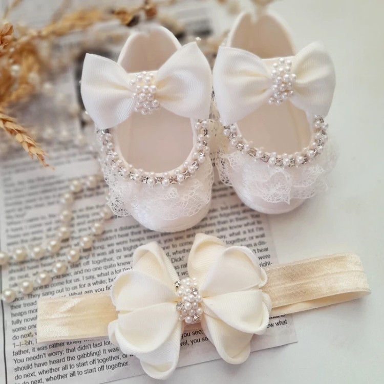 پاپوش وهد نوزادی طرح اطلس رنگ خامه ای ترکیب نگین و مروارید جنس رویه ساتن با استر