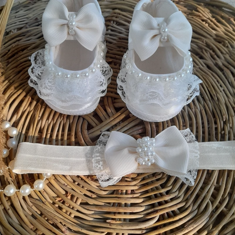 ست پاپوش و هد نوزادی ترکیب تور و مروارید ک یه کار شکیل و خوشکل شده جنس رویه کار ساتن و پارچه یی هست مناسب با آناتومی پای نوزاد در دو سایز صفر و یک سایز صفر برا کف پا 10س سایز یک برا کف پا 11س سوالی بود در خدمتم