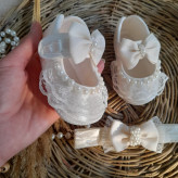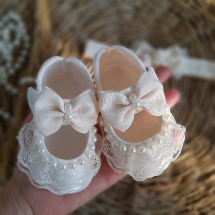 پاپوش نوزاد طرح دلبر ترکیب تور و مروارید رنگ خامه ای